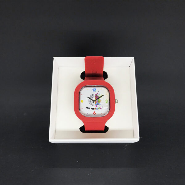 Relógio de cor vermelha, fundo branco e tons coloridos. Uso casual. Combina com qualquer estilo de roupa.